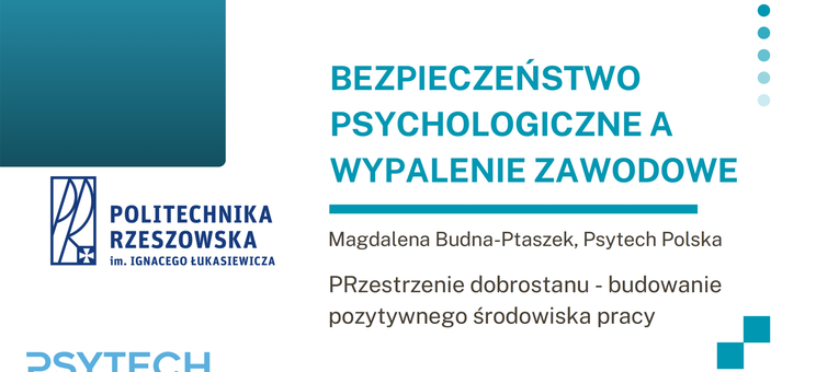 W dniu 19 lutego br. na Politechnice Rzeszowskiej odbyło się webinarium "Bezpieczeństwo psychologiczne a wypalenie zawodowe" poprowadzone przez Panią Magdalenę Budną-Ptaszek, psychologa pracy i stresu.