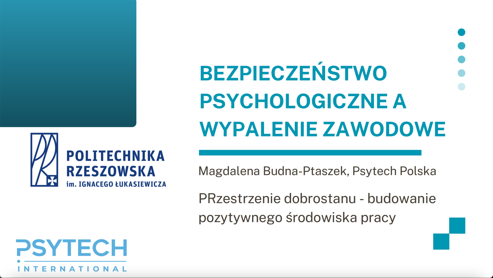 W dniu 19 lutego br. na Politechnice Rzeszowskiej odbyło się webinarium "Bezpieczeństwo psychologiczne a wypalenie zawodowe" poprowadzone przez Panią Magdalenę Budną-Ptaszek, psychologa pracy i stresu.