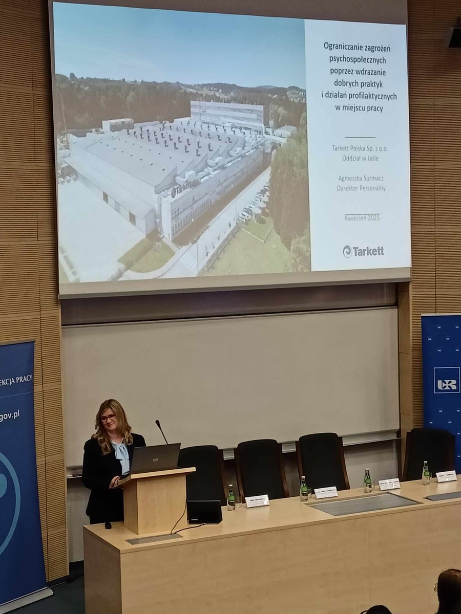 Jednym z ciekawszych punktów programu było zaprezentowanie dobrych praktyk w tym temacie. Swoje podejście do tematu zagrożeń psychospołecznych w zakładzie pracy, a właściwie do tematu dbania o dobrostan swoich pracowników przedstawiły przedstawicielki firmy Tarkett Sp. z o.o. z Jasła oraz Firmy Oponiarskiej Dębica S.A..
